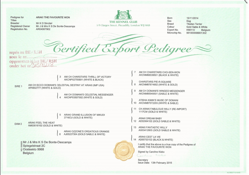 Båda föräldrarna är genetiskt fria rcd4, PLL, PRA3, NCL12 och DP-LHX3, är höftledsröntagde UA samt ögonlysta UA enligt Tibetanska Terriersällskapets riktlinjer.